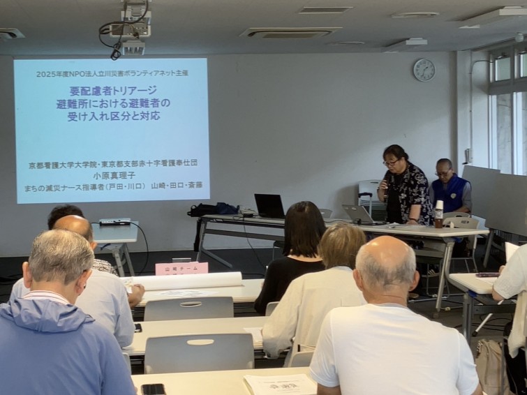 京都看護大学大学院特任教授 小原真理子氏による講演「要配慮者トリアージ 避難所における避難者の受け入れ区分と対応」の後、動画で避難所トリアージの様子を学び、グループに分かれて避難所トリアージのシュミレーションを行って、最後に課題を話し合ってグループ発表を行いました。